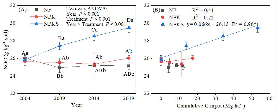 對(duì)于高強(qiáng)度利用的農(nóng)田生態(tài)系統(tǒng),秸稈還田被認(rèn)為是提升土壤有機(jī)碳、改善土壤肥力的有效措施。基于全球數(shù)據(jù)的Meta分析表明,連續(xù)12年的秸稈還田后土壤有機(jī)碳將達(dá)到飽和狀態(tài),因此,要揭示連續(xù)秸稈還田條件下土壤有機(jī)碳的動(dòng)態(tài)變化規(guī)律,需開(kāi)展長(zhǎng)期的田間動(dòng)態(tài)觀測(cè)。