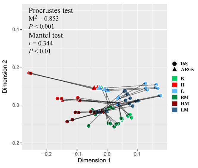 圖2普氏分析(Procrustes)顯示出ARGs組成與細(xì)菌群落之間具有顯著的相關(guān)性。B、H和L分別代表取自北安(有機(jī)質(zhì)含量高)、海倫(有機(jī)質(zhì)含量中)和梨樹(shù)(有機(jī)質(zhì)含量低)的黑土;M表示添加雞糞處理