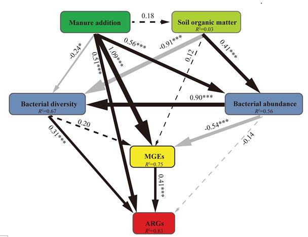 圖3結(jié)構(gòu)方程模型(SEM)闡明了糞肥添加、土壤有機(jī)質(zhì)、細(xì)菌多樣性、細(xì)菌豐度和MGEs對(duì)ARGs的直接和間接作用