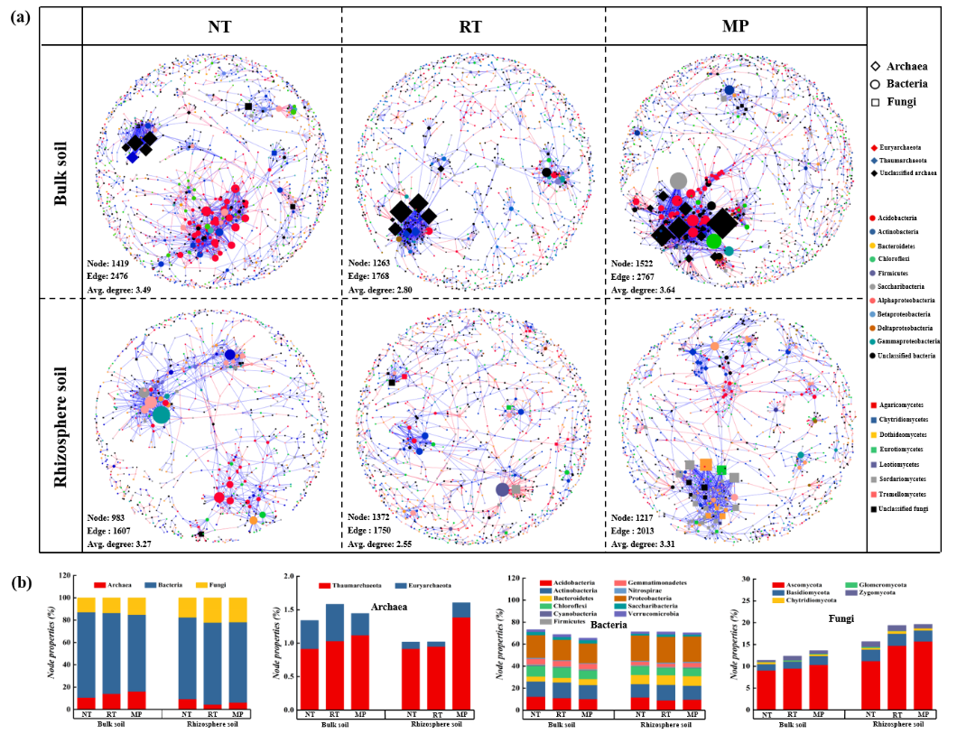 東北地理與農業生態研究所農田分子生態學科組和黑土有機碳與保護性耕作學科組,對免耕(NT)、少耕(RT)和傳統耕作(MP)處理下土壤微生物群落組成、裝配過程和分子網絡結構進行解析,探討了保護性耕作下黑土農田土壤微生物群落結構演替及發生機制對土壤質量和作物生產力的影響。研究結果表明,不同耕作方式顯著改變了根際和非根際土壤微生物群落,與傳統耕作MP相比,保護性耕作NT和RT顯著增加了硝化菌Nitrosospira sp.和固氮菌Mesorhizobium sp., Bradyrhizobium sp.和Burkholderia sp.相對豐度,但降低了具有有機質物分解功能的Blastococcus sp., Streptomyces sp.和Sphingomonas sp.相對豐度。網絡分析和隨機森林分析發現,上述功能菌在NT和RT處理中被注釋為關鍵物種(keystone taxa),這表明保護性耕作更有助于土壤碳固定,并促進土壤的生物固氮和硝化作用(圖1)。