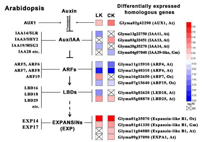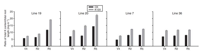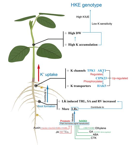 基于以上科學問題,大豆分子育種學科組張秋英研究員團隊通過對40個不同鮮食大豆品種(系)進行了鉀效率鑒定試驗,從中篩選出了代表性的鉀高效型材料進行了進一步的形態(tài)生理特征及其內(nèi)在機制解析。研究發(fā)現(xiàn),從鉀素的利用角度,低鉀條件下鉀高效型品種對鉀素的積累及干物質(zhì)的分配調(diào)控能力更強,表現(xiàn)出優(yōu)先供給庫器官,因而具有較高的收獲指數(shù)(HI)及鉀收獲指數(shù)(KHI)(圖1)。同時,低鉀對鉀高效型品種的光合參數(shù)、葉面積影響較小,對比葉重影響較大,促進葉綠素a/葉綠素b比值顯著增加。因此,低鉀環(huán)境下的強適應性及調(diào)節(jié)能力是影響鮮食大豆鉀素利用效率的關(guān)鍵;鉀素的吸收效率方面,鉀高效型鮮食大豆應對低鉀環(huán)境其根系的形態(tài)調(diào)節(jié)能力更強,通過增加總根長及側(cè)根數(shù)來增加根系與土壤的接觸面積,如鉀高效型材料側(cè)根數(shù)相比對照材料可高出30%,進而增強了植株鉀素的獲取能力。同時,鉀高效型材料的單位根長吸鉀量更高(圖2),在低鉀環(huán)境下根系活力、傷流量與鉀流量顯著增加,進一步保證了鉀素、水分及營養(yǎng)物的供應。轉(zhuǎn)錄組分析結(jié)果顯示,鉀高效型鮮食大豆根系在低鉀條件下受生長素信號調(diào)控的側(cè)根發(fā)育通路存在正向調(diào)控(圖3),同時與鉀素吸收利用密切相關(guān)的鉀離子通道基因AKT1及鉀轉(zhuǎn)運體基因HAK5基因的同源基因在鉀高效型材料根系中高量表達,這可能是影響根系形態(tài)調(diào)節(jié)及鉀離子吸收動力增加的重要內(nèi)因(圖4)。以上研究結(jié)果將為鉀高效型作物品種選育提供理論依據(jù),進而也為實現(xiàn)黑土保育、資源高效持續(xù)利用提供重要支撐。