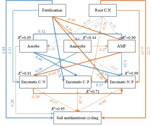 圖2. 施肥和根茬輸入碳氮比對土壤微生物量、酶化學計量比和養分循環的影響