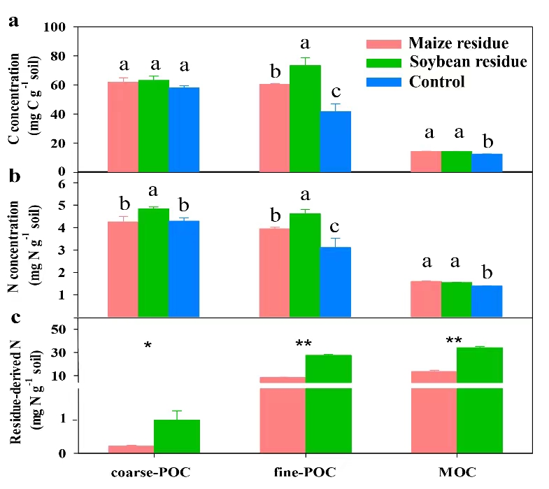 圖1. 培養250天后土壤有機質組分中碳(a)、氮(b)以及秸稈來源氮(c)含量