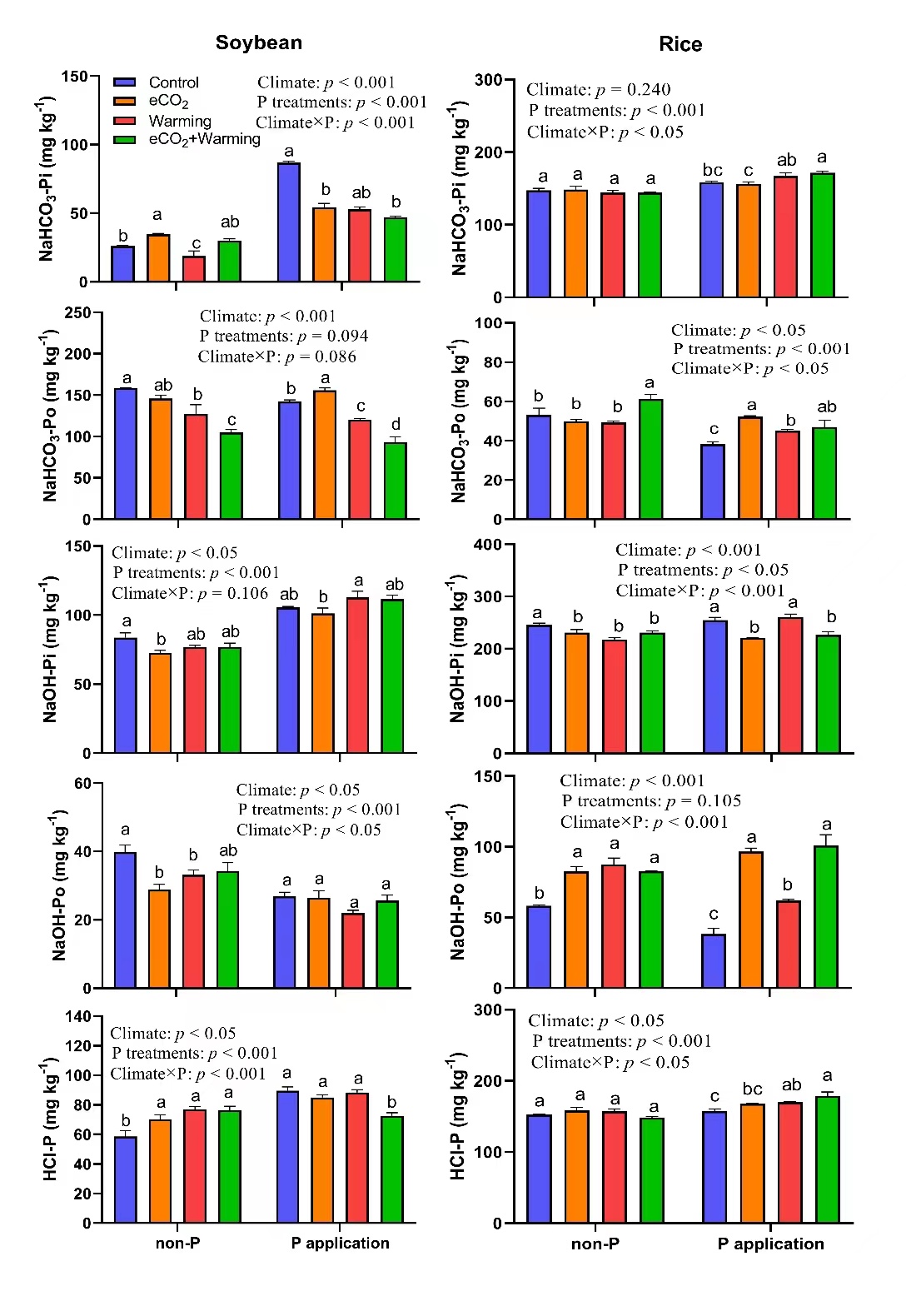 氣候變化深刻影響農(nóng)田生態(tài)系統(tǒng)養(yǎng)分循環(huán)。磷素(P)作為農(nóng)田生態(tài)系統(tǒng)中第二重要的植物營養(yǎng)元素,能夠調(diào)節(jié)作物對氣候變化的適應(yīng)性。因此,研究作物磷吸收和土壤磷動態(tài)對氣候變化下維持農(nóng)業(yè)生態(tài)系統(tǒng)可持續(xù)性至關(guān)重要。然而,大氣CO2濃度和溫度升高對作物生長和土壤磷組分的影響,以及相關(guān)微生物機(jī)制鮮有研究。