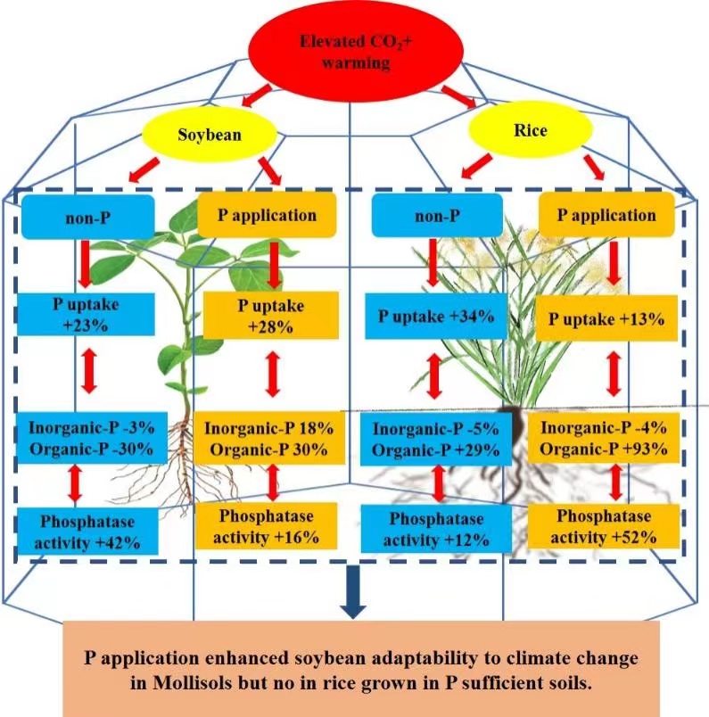 中國科學(xué)院東北地理與農(nóng)業(yè)生態(tài)研究所農(nóng)田分子生態(tài)學(xué)科組研究人員,利用開頂式氣候室(OTC)模擬大氣CO2濃度和溫度升高,種植大豆和水稻在施磷肥和不施磷肥條件下作物磷吸收及根際土壤磷轉(zhuǎn)化相關(guān)微生物分子生態(tài)特征。研究發(fā)現(xiàn),在施磷肥和不施磷肥條件下,大氣CO2濃度和溫度升高分別增加大豆磷吸收23%和29%,水稻磷吸收34%和13%。因此,施磷條件下大豆磷吸收對氣候變化的響應(yīng)更為明顯,而水稻則是在不施磷條件下更為顯著。而且,大氣CO2濃度和溫度同時(shí)升高降低大豆根際土壤有機(jī)磷含量,卻增加水稻根際土壤有機(jī)磷含量(圖1)。大豆根際有機(jī)磷含量與酸性磷酸酶活性呈負(fù)相關(guān)關(guān)系,然而在水稻根際呈正相關(guān)關(guān)系。因此,氣候變化影響大豆根際土壤磷轉(zhuǎn)化以有機(jī)磷礦化為主,而水稻則以磷固定為主。此外,大氣CO2濃度和溫度同時(shí)升高增加了大豆施磷土壤磷轉(zhuǎn)化相關(guān)基因豐度,如phoD(堿性磷酸酶合成基因)、phoC(酸性磷酸酶合成基因)、pstS(磷酸鹽特異性轉(zhuǎn)運(yùn)蛋白酶)和phnX(磷酸酯酶基因),提出大豆根際有機(jī)磷的礦化是磷轉(zhuǎn)化的主要生物學(xué)過程,而水稻根際土土壤磷轉(zhuǎn)化主要以磷固定為主,而且根際土壤有效磷主要來自于無機(jī)磷的活化(圖2)。此研究揭示了作物—土壤—微生物系統(tǒng)磷循環(huán)的相關(guān)機(jī)理,為氣候變化條件下不同作物磷肥管理策略提供了理論基礎(chǔ)。