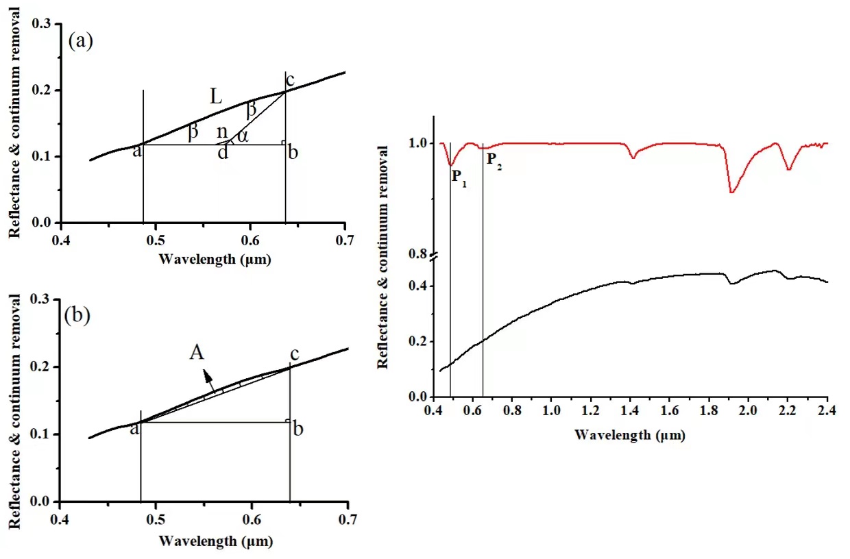 光譜特征參數(shù)是對光譜曲線吸收特征的描述,在土壤屬性預(yù)測和土壤分類中被很多廣泛使用。對于土壤分類,因不同土壤的理化性質(zhì)差異會引起土壤在不同波長上的光譜反射差異,光譜特征參數(shù)可以有效的區(qū)分不同土壤類型。但對于土壤屬性預(yù)測,光譜特征參數(shù)的使用不如光譜微分和數(shù)學(xué)變換普遍,而且使用的光譜特征參數(shù)都是基于包絡(luò)線去除后提取的吸收深度、吸收面積或吸收位置等。本研究發(fā)現(xiàn),對于低有機(jī)質(zhì)含量的土壤,隨著SOM含量的變化,在土壤反射光譜曲線上的可見光部分具有較明顯的形狀變化。
