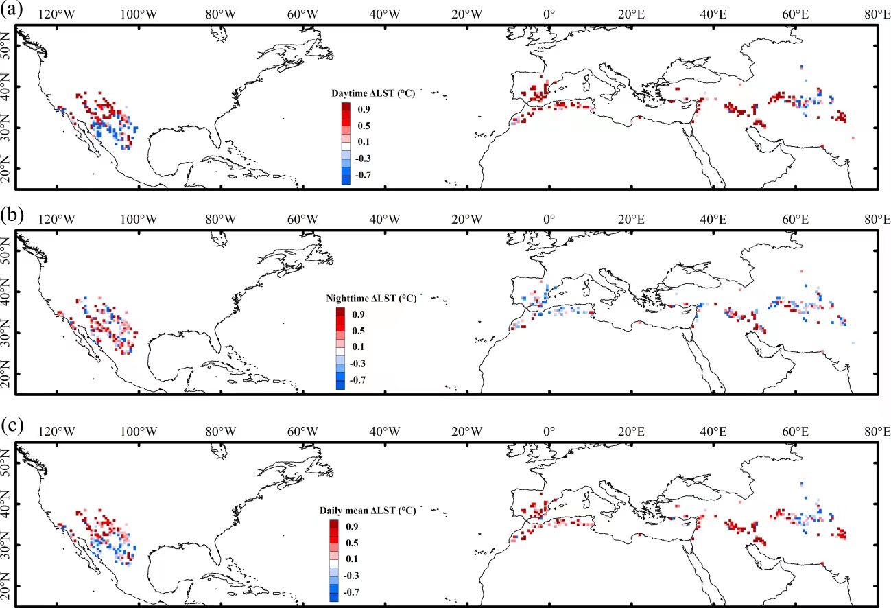 氣候變化和人類活動影響下,全球許多地區(qū)尤其北半球溫帶干旱半干旱地區(qū),草原生態(tài)系統(tǒng)正普遍發(fā)生灌木入侵即“草原灌叢化”現(xiàn)象。草原灌叢化不僅影響草原生態(tài)系統(tǒng)植被組成,還可能通過影響生物地球化學(xué)和物理過程對區(qū)域氣候產(chǎn)生一定影響。在過去幾十年,盡管草原灌叢化已成為北半球溫帶半干旱地區(qū)草原面臨的一大生態(tài)問題,但草原灌叢化對該地區(qū)氣候可能帶來怎樣影響尚不明確。基于衛(wèi)星獲取的土地利用/覆被數(shù)據(jù)、陸地表面溫度、地表反照率、蒸散發(fā)、葉面積指數(shù)等數(shù)據(jù),東北地理所濕地生態(tài)系統(tǒng)管理學(xué)科組定量分析了北半球溫帶半干旱地區(qū)草原灌叢化對區(qū)域地表溫度的影響。