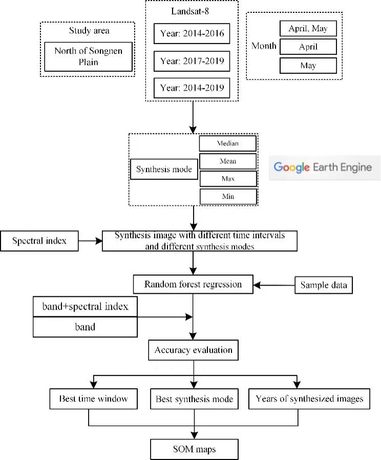 中國科學院東北地理所農業(yè)遙感學科組基于Google Earth Engine云平臺結合機器學習算法與實地采樣數據,分別從多時相影像合成、時間窗口選擇、輸入量優(yōu)選、局部回歸等多角度提升土壤有機質的制圖精度,研發(fā)了一系列適用于東北黑土區(qū)的高魯棒性土壤有機質制圖方法(圖1&2)。
