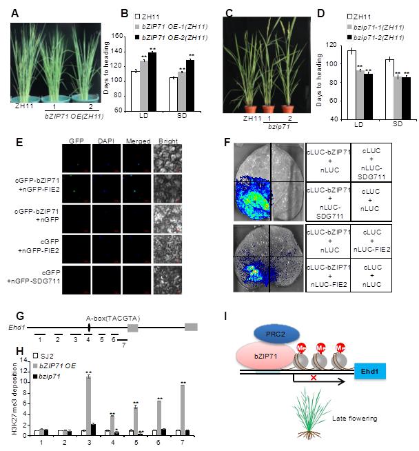 該項(xiàng)研究揭示了bZIP71調(diào)控水稻抽穗期的新機(jī)制,其功能發(fā)揮不依賴于Hd2、Hd4和Hd5,而是通過(guò)與多梳抑制復(fù)合體2(PRC2)的兩個(gè)成員SDG711和FIE2的互作,調(diào)控Ehd1的H3K27me3水平。