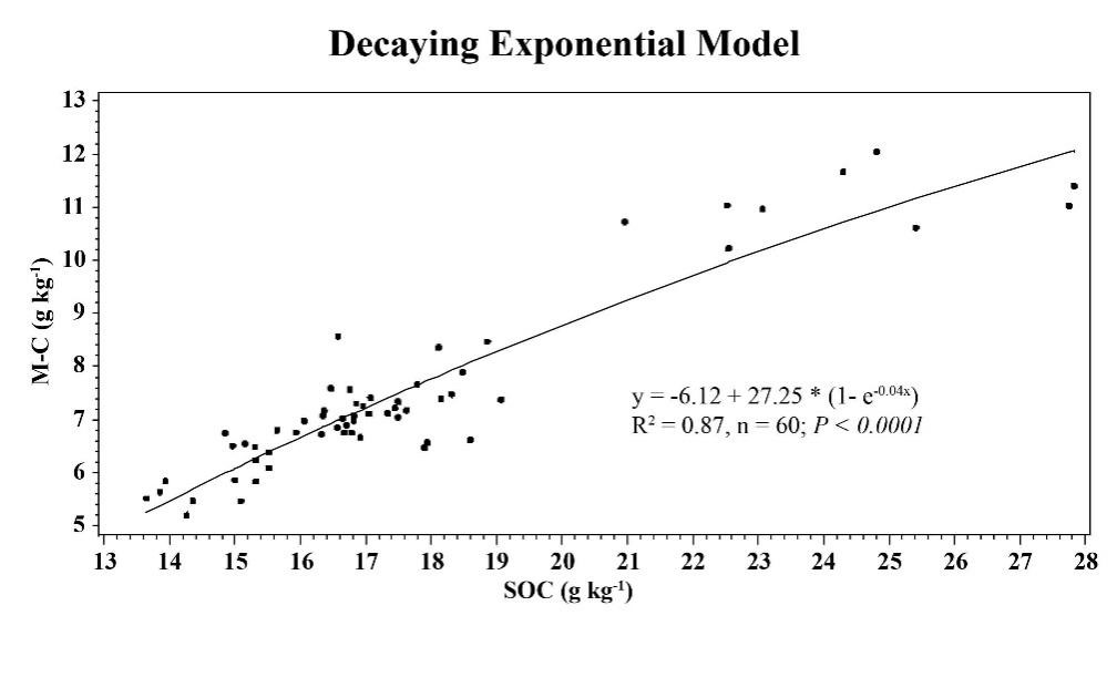 微生物殘?bào)w穩(wěn)定性較高,對(duì)土壤有機(jī)碳(SOC)的長(zhǎng)期固存具有重要作用。氨基糖的主要來(lái)源是真菌和細(xì)菌且在土壤中很穩(wěn)定。氨基糖對(duì)秸稈還田和耕作方式響應(yīng)很明顯,不同作物還田對(duì)氨基糖的影響也不一致。中科院東北地理所黑土有機(jī)碳與保護(hù)性耕作學(xué)科組科研人員依托吉林省德惠市始建于2001年的保護(hù)性耕作長(zhǎng)期定位實(shí)驗(yàn)開(kāi)展了相關(guān)研究,包含5個(gè)處理:免耕玉米-大豆輪作(NTCS)、秋翻玉米-大豆輪作(MPCS)、免耕玉米連作(NTCC)、秋翻玉米連作(MPCC)、常規(guī)耕作玉米連作且秸稈不還田(CTCC)。于2017年采集了不同深度的土壤樣品,測(cè)定氨基糖以計(jì)算微生物殘?bào)w碳、真菌殘?bào)w碳)和細(xì)菌殘?bào)w碳及其儲(chǔ)量。三因素方差分析表明,耕作方式、深度及其交互作用對(duì)所有氨基糖含量均有顯著影響。然而,不同土層的兩因素方差分析表明,耕作方式對(duì)所有氨基糖的影響主要發(fā)生在0-5cm土層。衰減指數(shù)模型(decaying exponential model,圖1)表明微生物殘?bào)w碳和SOC之間的關(guān)系(R2=0.87)。耕作對(duì)微生物殘?bào)w碳、真菌殘?bào)w碳和細(xì)菌殘?bào)w碳的儲(chǔ)量有很大影響,但對(duì)它們?cè)赟OC儲(chǔ)存中的分布比例沒(méi)有影響。