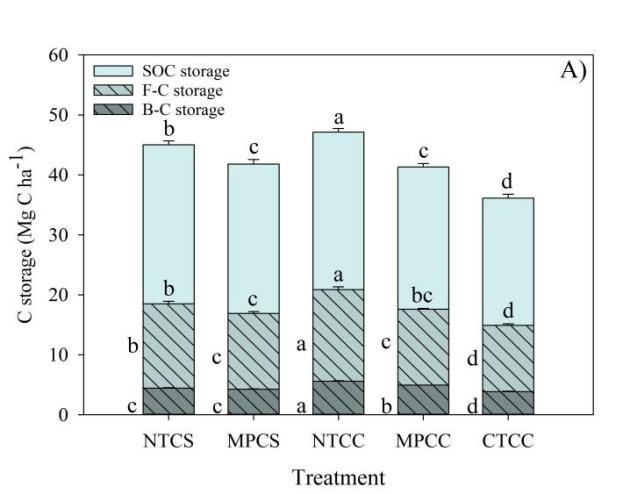 玉米連作系統(tǒng)下,超過(guò)50%的SOC儲(chǔ)量增量發(fā)生于微生物殘?bào)w碳中(0-20 cm),這主要由于秸稈還田,而且該增量比玉米-大豆輪作系統(tǒng)高(圖2)。真菌殘?bào)w碳儲(chǔ)量在SOC中的比例不受農(nóng)田管理措施(秸稈還田、耕作方式、種植制度)的影響,而細(xì)菌殘?bào)w碳的占比同時(shí)受到秸稈還田的數(shù)量和質(zhì)量的影響。相比于玉米輪作系統(tǒng),玉米連作更有利于微生物死體碳的固存,細(xì)菌對(duì)農(nóng)田管理措施的敏感性相對(duì)高于真菌。因此,本文證明了秸稈覆蓋有利于微生物殘?bào)w碳的累積,對(duì)有機(jī)碳的長(zhǎng)期穩(wěn)定與固存有重要意義,其中玉米連作的固碳能力更強(qiáng),該結(jié)果對(duì)未來(lái)農(nóng)田黑土秸稈管理措施的制定提供指導(dǎo)作用。