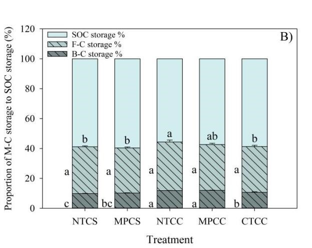 圖2 a)微生物殘?bào)w碳、真菌殘?bào)w碳以及細(xì)菌殘?bào)w碳儲(chǔ)量;b)微生物殘?bào)w碳、真菌殘?bào)w碳以及細(xì)菌殘?bào)w碳儲(chǔ)量與總有機(jī)碳儲(chǔ)量比例