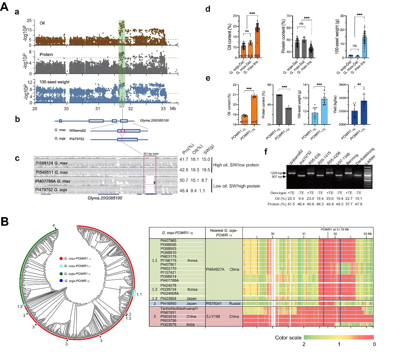 本研究利用經(jīng)典連鎖QTL分析結(jié)合基因組測序數(shù)據(jù)聯(lián)合分析,鑒定到位于20號(hào)染色體的一個(gè)主效QTL cqPro-20。該QTL自1992年首次鑒定,在不同遺傳背景中被鑒定到,但基因不清楚,發(fā)掘其控制基因一直是大豆蛋白研究的主要內(nèi)容。研究發(fā)現(xiàn)一個(gè)編碼CCT結(jié)構(gòu)域的基因POWR1(Protein, Oil, Weight Regulator 1)控制cqPro-20,一個(gè)321-bp轉(zhuǎn)座子在CCT結(jié)構(gòu)域的插入/缺失是該位點(diǎn)引起蛋白和油脂變異的主因(圖1A)。通過群體基因組學(xué)、近等基因系和大豆遺傳轉(zhuǎn)化研究證實(shí)POWR1調(diào)控蛋白質(zhì)和油份含量,同時(shí)影響粒重和田間產(chǎn)量;突變和野生型分別控制高油和高蛋白表型,從遺傳上解釋了部分蛋-油負(fù)相關(guān)遺傳基礎(chǔ)。研究也表明POWR1是大豆馴化的重要基因之一,高油基因型受到強(qiáng)烈選擇,推斷對高油基因型的強(qiáng)烈選擇主要是由于對大籽粒的優(yōu)先選擇而導(dǎo)致。高蛋白基因型在栽培大豆中含量很少且主要分布在亞洲,并且在POWR1位點(diǎn)有明顯的基因?qū)牒圹E(圖1B),推測與本地高蛋白育種需求有關(guān),符合亞洲自古都是大豆蛋白主要消費(fèi)地的認(rèn)識(shí)。這項(xiàng)研究為闡明大豆蛋白質(zhì)和油份的分子調(diào)控機(jī)制以及高蛋白的精準(zhǔn)分子育種帶來了機(jī)遇。