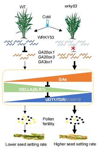 該研究揭示了OsWRKY53轉錄抑制GA生物合成基因來調控花藥中GA含量,從而負調控水稻孕穗期耐冷性;GA通過解除OsSLR1對OsUDT1/OsTDR的抑制,來調控水稻育性;不同優良品種背景下oswrky53水稻材料孕穗期耐冷性顯著提高,且低溫脅迫條件下oswrky53突變體植株產量顯著高于對照。該研究為水稻孕穗期耐冷分子育種提供有價值的位點。