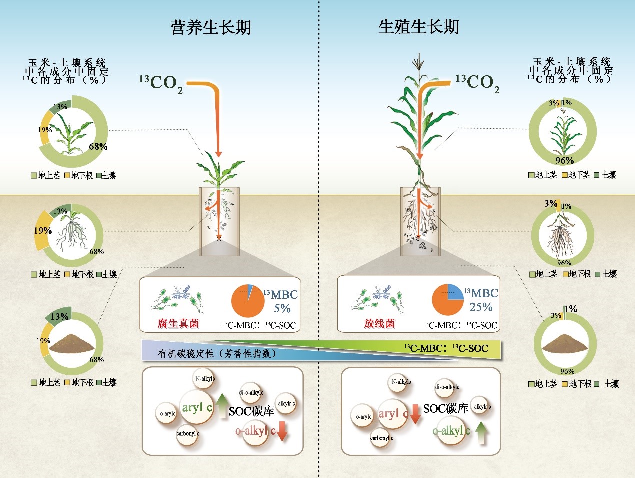 結果表明,腐生真菌在營養期對標記C的摻入起重要作用,而放線菌在生殖期占優勢。此外,固定在微生物生物量C(13C-MBC)中的標記C對固定在土壤有機C(13C-SOC)中的總標記C的貢獻從營養期的5%增加到生殖期的25%,盡管在兩個生長階段13C-MBC的量幾乎相同。營養期和生殖期土壤C化學組成的差異主要體現在芳基C和O-烷基C中,營養期的芳基C比例較高,生殖期的O-烷基碳比例較高。此外,腐生真菌和放線菌與各個玉米生長階段SOC中較高比例的芳基C和O-烷基C有關。研究結果強調了土壤微生物在玉米生長過程中對根際碳沉積的連續處理和螯合中的重要作用。進一步的研究應更多地關注不同作物品種和田間條件下管理實踐中SOC形成所涉及的微生物過程,以闡明根際沉積對固碳和土壤肥力的重要性。