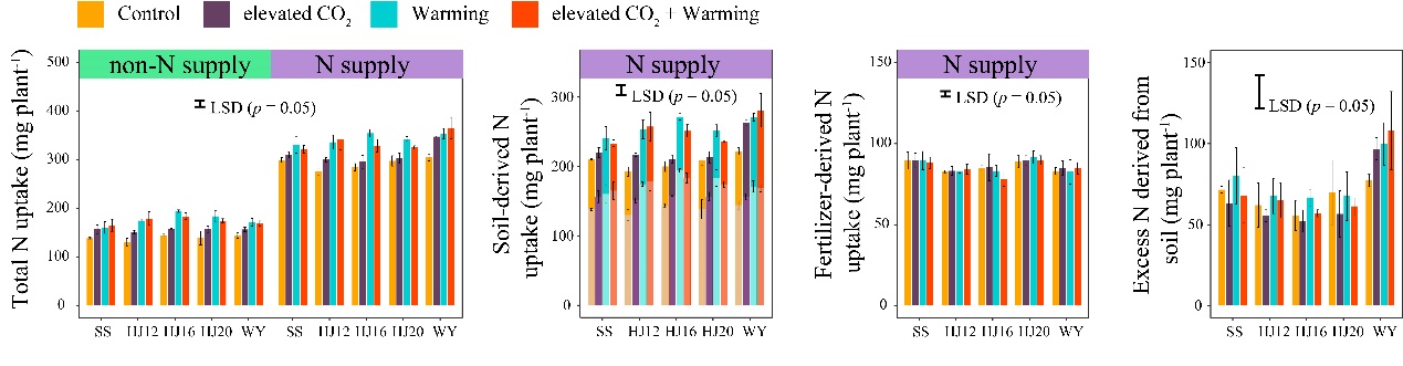 圖2 大氣CO2濃度和溫度升高條件下,5個品種水稻的總氮吸收以及來源土壤和肥料的氮吸收