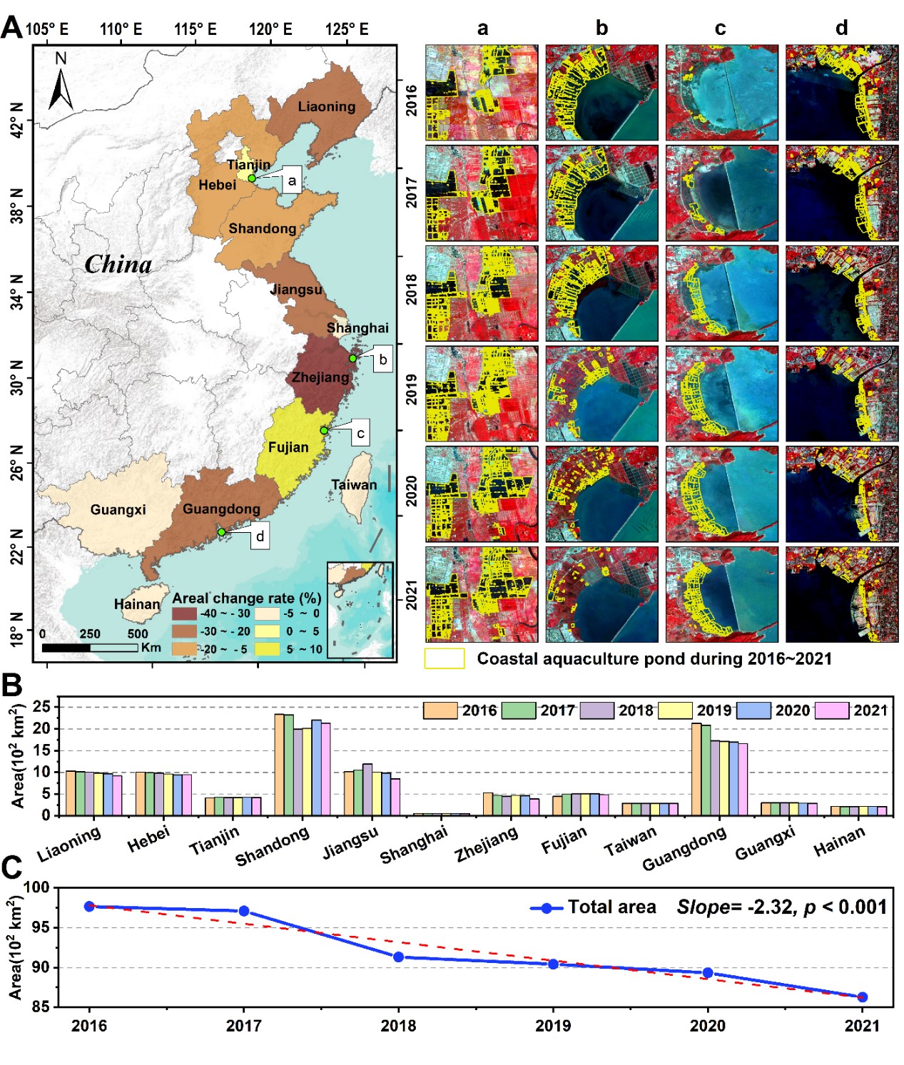 研究結果表明,2021年中國濱海養殖池總面積達8628.79 km2,在2016-2021年期間,中國濱海養殖池持續減少,凈損失1139.97 km2,下降幅度為13.21%。浙江省濱海養殖池減少最為顯著(38.24%),其次是廣東(27.93%)和江蘇(19.87%);福建和天津的濱海養殖池面積略有增加,增加幅度分別為7.24%和2.13%。在退塘還濕等政策支持下,中國濱海濕地保護與恢復的成效顯著。
