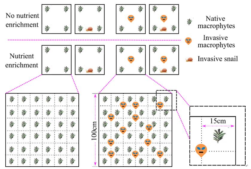 針對(duì)以上研究空白,中科院東北地理所生物入侵生態(tài)學(xué)團(tuán)隊(duì)與中科院亞熱帶所洞庭湖站研究人員共同合作實(shí)施了一個(gè)中宇宙實(shí)驗(yàn),探究水體富營(yíng)養(yǎng)化如何影響外來(lái)動(dòng)物福壽螺與外來(lái)水生植物粉綠狐尾藻的共同入侵以及三者如何交互影響本地植物群落。實(shí)驗(yàn)設(shè)計(jì)如圖1所示:對(duì)由三種水生植物組成的本地群落分別施加入侵動(dòng)物福壽螺(有采食vs無(wú)采食)、入侵植物粉綠狐尾藻(有植物入侵vs無(wú)植物入侵)和養(yǎng)分富集(是與否)的全因子處理。
