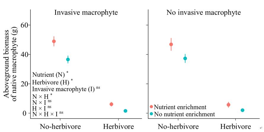 (1)富營(yíng)養(yǎng)化顯著增加了本地植物群落的地上生物量,但不影響入侵植物粉綠狐尾藻的地上生物量(圖2)。因此,養(yǎng)分富集降低了群落中入侵植物粉綠狐尾藻的生物量占比(圖3b)。