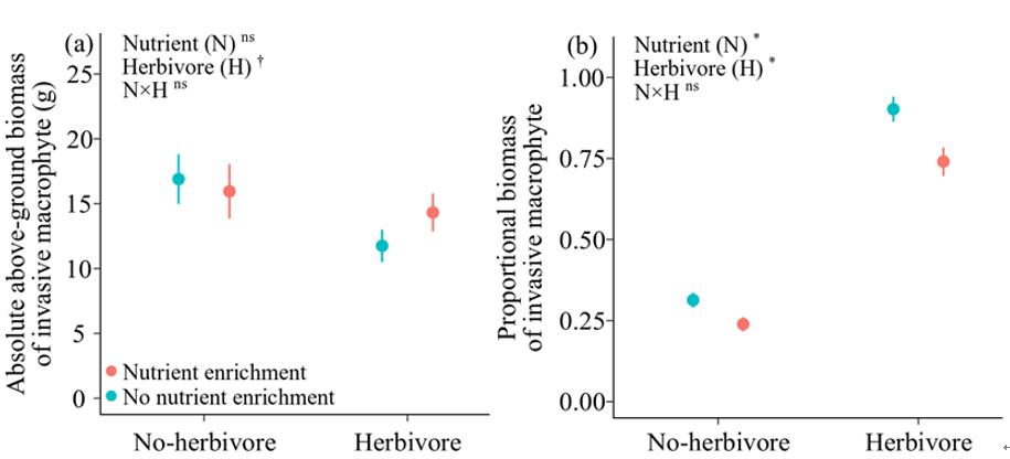 人類活動(dòng)和全球氣候變化的加劇導(dǎo)致許多生態(tài)系統(tǒng)經(jīng)歷著外來(lái)植物與外來(lái)動(dòng)物的同時(shí)入侵。 “入侵崩潰假說(shuō)”(Invasional meltdown hypothesis)認(rèn)為,多種外來(lái)生物在入侵同一生態(tài)系統(tǒng)時(shí)會(huì)相互促進(jìn)彼此的入侵進(jìn)程,加劇對(duì)本地群落的負(fù)面影響。盡管該假說(shuō)得到了許多實(shí)證研究的支持,但對(duì)于水生生態(tài)系統(tǒng)中來(lái)自同一產(chǎn)地的外來(lái)植物與外來(lái)植食性動(dòng)物的協(xié)同入侵機(jī)制仍缺乏足夠關(guān)注。因協(xié)同進(jìn)化歷史的差異,外來(lái)植食性動(dòng)物對(duì)與其同一原產(chǎn)地的外來(lái)植物產(chǎn)生的負(fù)面影響要弱于對(duì)本地植物產(chǎn)生的負(fù)面影響。因此,似然競(jìng)爭(zhēng)(Apparent competition)可能會(huì)調(diào)控兩者的協(xié)同入侵過(guò)程。另外,除生物入侵外,水體富營(yíng)養(yǎng)化也成為威脅淡水生態(tài)系統(tǒng)健康的重要環(huán)境問(wèn)題,其是否會(huì)與生物入侵互作影響本地群落也有待明確。