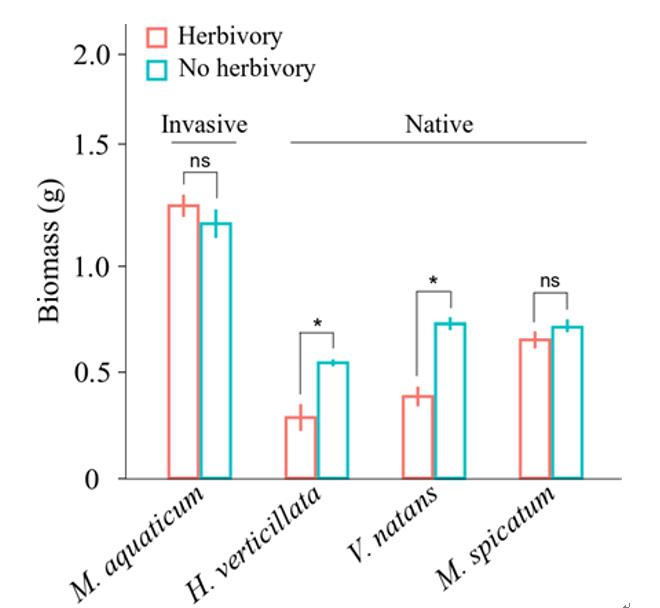 圖4福壽螺取食對(duì)外來(lái)植物(粉綠狐尾藻)和本地植物(黑藻、苦草、穗狀狐尾藻)生物量的影響