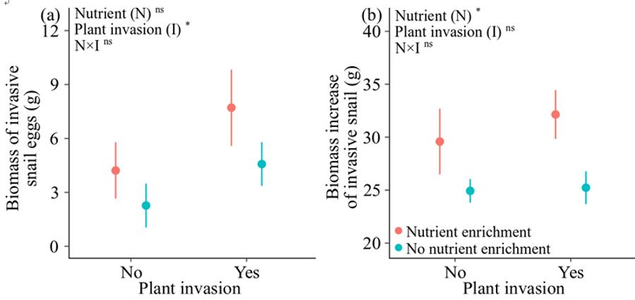 (4)福壽螺生長(zhǎng)與繁殖的記錄數(shù)據(jù)表明,入侵植物粉綠狐尾藻的存在極大地提高了入侵動(dòng)物福壽螺的產(chǎn)卵量(圖5a);并且,富營(yíng)養(yǎng)化導(dǎo)致入侵動(dòng)物福壽螺的生物量顯著增加(圖5b)。
