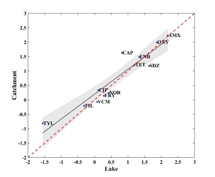 圖3. 12種抗生素在湖泊和周邊匯水區離散性分布