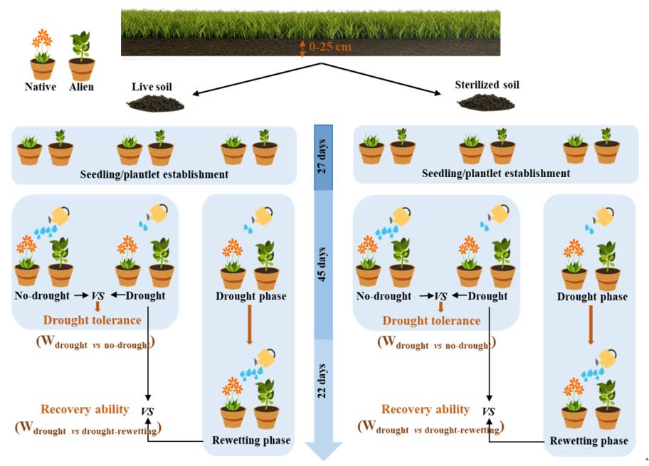 基于以上研究空白,中科院東北地理所生物入侵生態(tài)學(xué)研究團(tuán)隊(duì)設(shè)計(jì)了一個(gè)溫室盆栽實(shí)驗(yàn)(圖1):將4對同屬的外來入侵植物與本地植物單獨(dú)種植,并對其進(jìn)行水分控制(正常澆水 vs. 干旱 vs. 干旱-再濕潤處理) × 土壤滅菌(滅菌 vs. 不滅菌)的全因子處理。