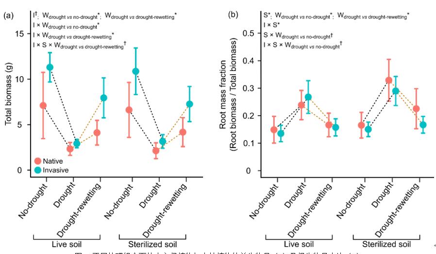 因此,盡管干旱可能會(huì)抑制外來入侵植物的競爭優(yōu)勢,但是干旱-再濕事件與土壤微生物卻協(xié)同加劇了外來入侵植物對本地植物的生長優(yōu)勢,促進(jìn)植物入侵。