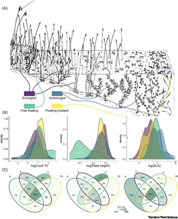 (1)為適應(yīng)不同水生生境特有的水淹、光照、養(yǎng)分、水體流速等環(huán)境因子,不同生長(zhǎng)型水生植物的功能性狀表達(dá)存在差異(圖1A);不同水生植物生長(zhǎng)型所特有的生長(zhǎng)和適應(yīng)策略呈現(xiàn)出不同的功能性狀組合(圖1B和圖1C)。