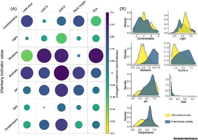 (2)水生植物的功能性狀可以用來(lái)指示其所在生態(tài)系統(tǒng)特征。以Ellenberg指數(shù)為例,不同水生植物功能性狀對(duì)其生境的大陸性、光照、濕潤(rùn)度、營(yíng)養(yǎng)、pH值、鹽度、溫度等指標(biāo)具有相應(yīng)的指示作用(圖2A),并展示出與其他陸生植物不同的格局和趨勢(shì)(圖2B)。