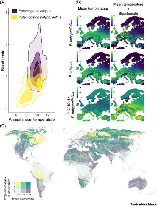 (3)通過(guò)對(duì)兩種常見(jiàn)眼子菜屬植物的生態(tài)位模擬研究發(fā)現(xiàn),未來(lái)氣候變化所導(dǎo)致的溫度和水體碳酸氫根濃度變化,對(duì)菹草和蓼葉眼子菜的環(huán)境適合度及其分布格局具有非對(duì)稱影響,這充分表明全球變化對(duì)于水生植物乃至水生生態(tài)系統(tǒng)影響的復(fù)雜性。