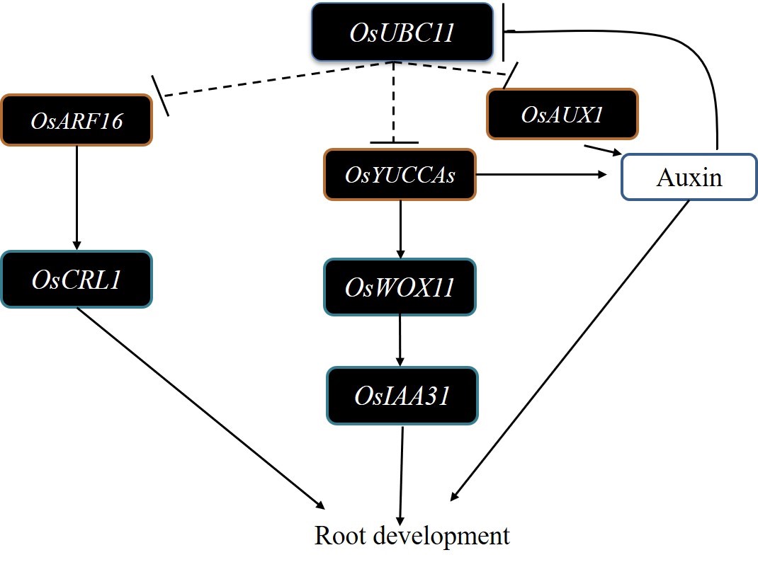 因此,尋找水稻根系發(fā)育調控基因并驗證其功能一直是水稻育種工作者關注的重點之一。我所方軍研究團隊與興安盟農牧業(yè)科學研究所徐興健研究團隊合作,在Rice(中科院一區(qū)TOP)上發(fā)表了題為“Ubiquitin-conjugating enzyme OsUBC11 affects the development of roots via auxin pathway”研究論文,研究人員鑒定出一個泛素結合酶基因OsUBC11調控了水稻主根及側根的伸長,闡釋了OsUBC11參與生長素途徑來調控根的發(fā)育,為水稻根系發(fā)育研究及泛素結合酶分子調控機制提供新的思路(圖2)。這對水稻根系發(fā)育調控網(wǎng)絡提供重要補充,也為泛素結合酶家族基因的具體分子調控機制提供了新見解。