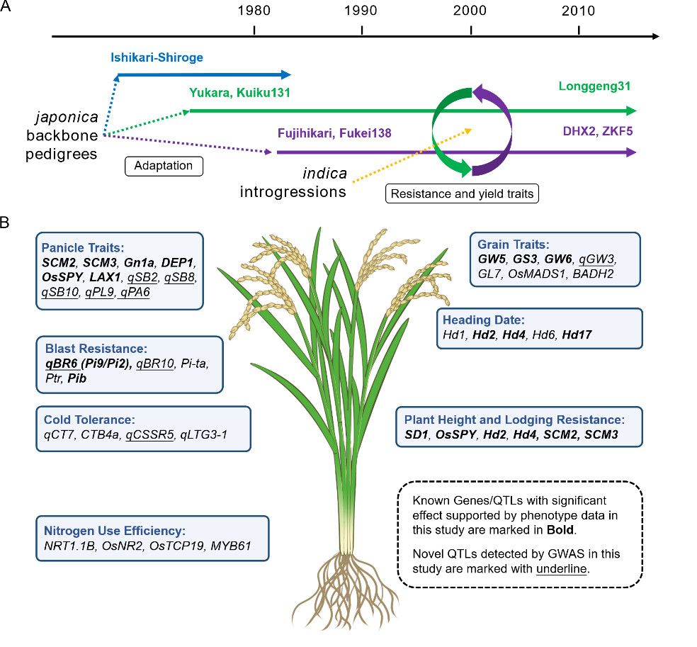 研究團(tuán)隊收集了涵蓋東北稻區(qū)自1940年代到2010年代選育或引種的546份水稻品種資源,進(jìn)行了重測序和22個農(nóng)藝性狀表型的調(diào)查。研究發(fā)現(xiàn)東北地區(qū)水稻品種可歸類到3個具有不同進(jìn)化特征的亞群(圖1),以石狩白毛為骨干的K3G1亞群在上世紀(jì)80年代前的黑龍江品種中占主導(dǎo)地位,隨后被以蝦夷和空育131為骨干的K3G2亞群取代;而以富士光和藤系138為骨干的K3G3亞群主要分布在遼寧和吉林,但隨著時間推移,其在黑龍江省的占比也越來越高。同時確認(rèn)了秈稻滲入對東北水稻稻瘟病抗性和穗部性狀的重要貢獻(xiàn)。將品種選育印記追溯到123個已知或新檢測到的QTL位點以及大量秈稻滲入片段,系統(tǒng)總結(jié)了一些具有年代特征的關(guān)鍵性QTL位點或滲入片段,為后繼的品種設(shè)計選育提供了依據(jù)(圖1)。