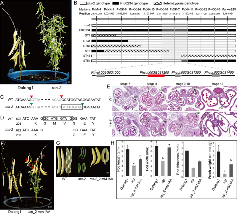 東北地理所研究團隊利用SNP測序和自主設計的菜豆InDel分子標記,通過圖位克隆的方法精細定位了菜豆雄性育性基因MS-2為Phvul.003G031200基因(圖B);在ms-2突變體中Phvul.003G031200基因剪切位點發(fā)生變異,使得蛋白質(zhì)序列缺少3個氨基酸(圖C-D);利用石蠟切片對小孢子體發(fā)育過程進行觀察,發(fā)現(xiàn)MS-2基因的剪切位點變異導致絨氈層降解提前是ms-2突變體雄性不育的原因(圖E)。ms-2突變體可結實大量的無籽肉莢,外源噴施2 mM生長素物質(zhì)吲哚乙酸(IAA)能使ms-2突變體上的肉質(zhì)無籽莢的莢長、莢寬、莢厚和單莢鮮重顯著增加(圖F-H),體積增大的無籽肉莢具有加工或直接食用的潛能。本研究定位與克隆了菜豆雄性育性基因MS-2.明確了該基因突變導致菜豆不育的機理。MS-2基因可應用于培育肉質(zhì)無籽莢菜豆品種,具有很好的應用價值,同時為雜種優(yōu)勢的利用奠定了堅實的理論基礎。