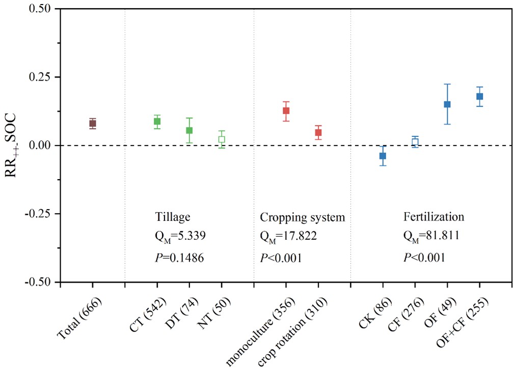 中科院東北地理所黑土保護與利用學(xué)科組科研人員基于91篇文獻666組研究數(shù)據(jù)進行Meta分析,以闡明土壤管理類型(耕作、施肥和種植制度)對SOC含量的影響及其驅(qū)動因素。結(jié)果表明,整體上土壤管理使土壤有機碳含量顯著提高了8.3%。施用有機肥(OF) SOC含量顯著提高16.2%,且隨施肥量的增加而逐漸提高。有機肥與化肥配施顯著提高19.6%,不施肥顯著降低3.9%。土壤有機碳含量在常規(guī)耕作和深耕下分別顯著提高了9.3%和5.6%,而免耕作為一種保護性耕作方式,提高有機碳含量的潛力有限。玉米連作條件下,提高有機碳含量的能力優(yōu)于輪作(圖1)。