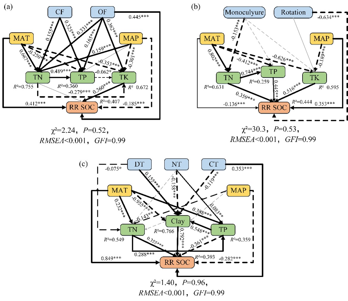 此外,meta分析土壤有機碳含量的效應(yīng)值大小與粘土含量和土壤養(yǎng)分顯著相關(guān)。土壤有機碳和養(yǎng)分含量的增加也與東北地區(qū)獨特的氣候(MAT和MAP)和粘粒含量密切相關(guān)(圖2)。Meta分析總體上對土壤管理類型對有機碳含量的影響進行了全面的定量評估,這將有助于進一步了解土壤SOC含量對不同土壤管理類型的響應(yīng),并有助于確定東北地區(qū)最適宜的土壤管理類型。