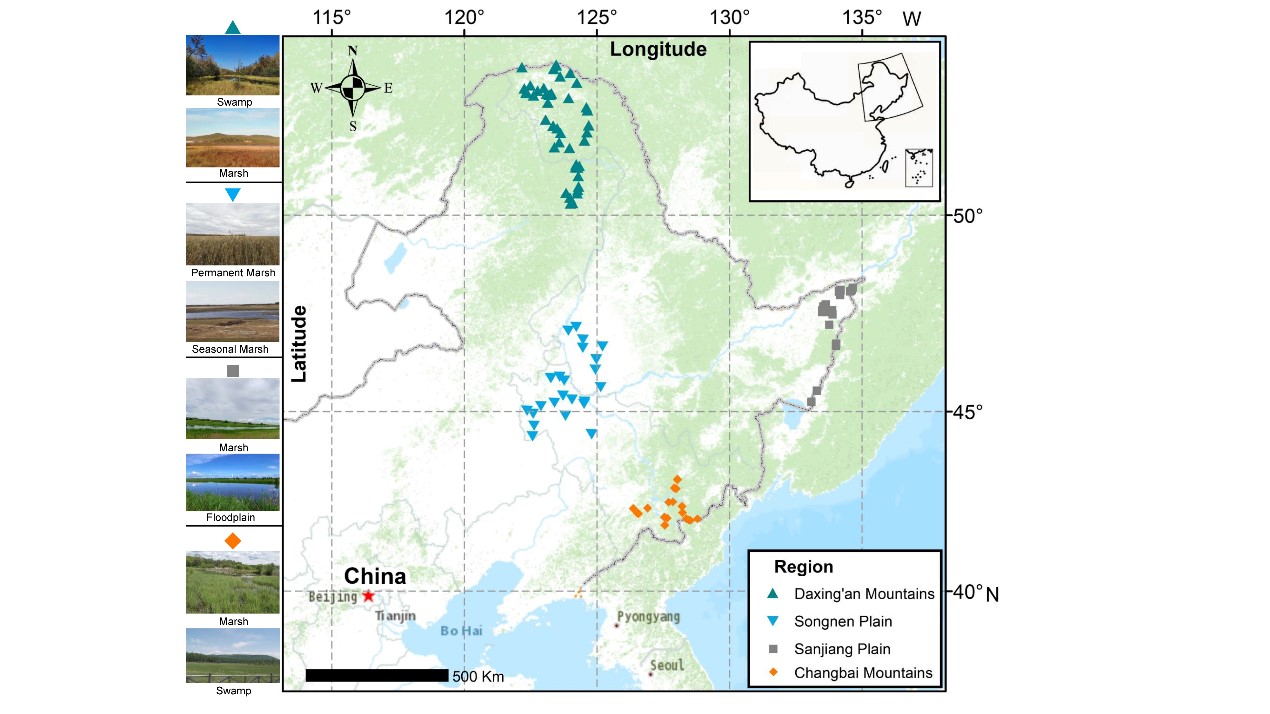 東北是我國沼澤濕地最大的集中分布區,其水生生物多樣性的地理分布格局及形成機制尚不明確。為此,東北地理所以三江平原、松嫩平原、大興安嶺和長白山區126處沼澤濕地為研究對象,對腹足綱螺類開展了為期8年(2013-2020年)的大尺度研究,旨在揭示東北平原淡水沼澤、鹽堿泡沼、山地沼澤等濕地螺類多樣性(結合分類組成、功能形狀和系統發育關系來表征)的地理格局與其關鍵形成機制。