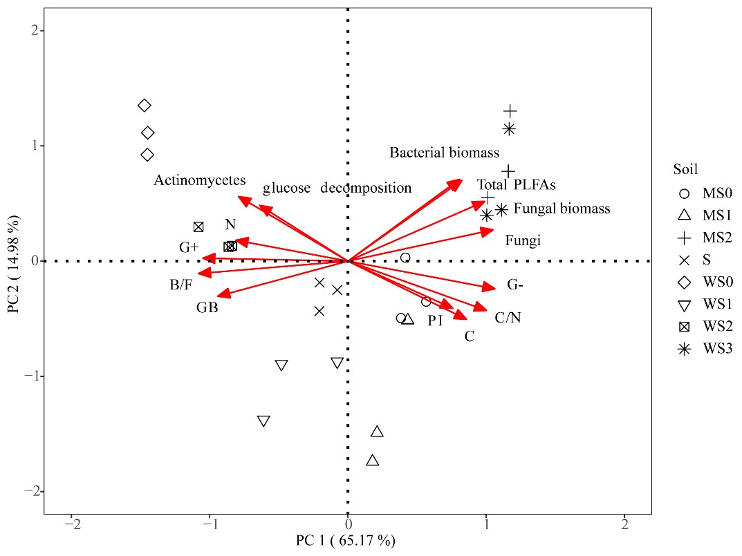 研究表明,在連作系統(tǒng)中,小麥連作土壤具有最高的土壤有機碳礦化速率,其次是大豆連作,玉米連作的土壤有機碳礦化速率最低。與未添加葡萄糖的處理相比,葡萄糖添加分別使小麥和玉米輪作系統(tǒng)中土壤累積碳礦化增加了195%–230%和255%–300%(圖1a)。大豆參與的小麥和玉米輪作系統(tǒng)中,葡萄糖添加引起的激發(fā)效應(yīng)分別比小麥和玉米連作增加了27%–38%和22%–26%,但大豆種植頻率對小麥和玉米輪作系統(tǒng)中PE的影響不顯著(圖1)。在小麥和玉米輪作系統(tǒng)中,大豆的參與增加了土壤C/N比及真菌生物量,降低了土壤細(xì)菌/真菌的比值,促進了土壤激發(fā)效應(yīng)的強度(圖2),但大豆種植頻率對土壤有機碳激發(fā)效應(yīng)的影響不顯著。研究結(jié)果為通過調(diào)整豆科作物參與的輪作體系促進土壤碳固定提供了科學(xué)依據(jù)。