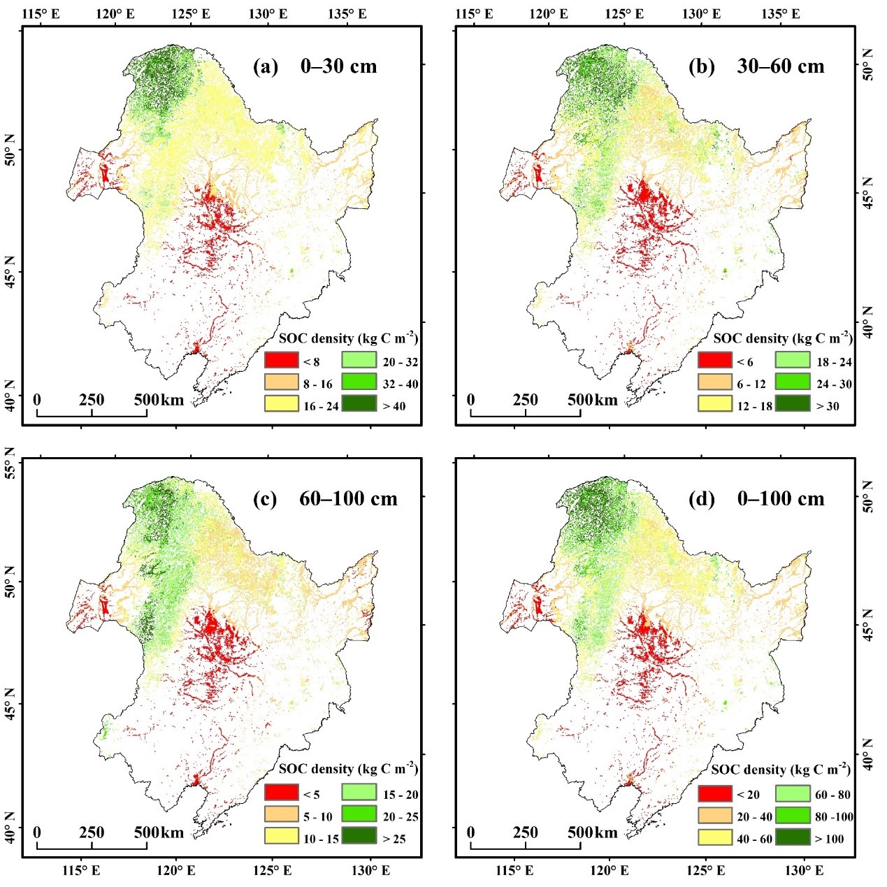 研究結果表明:基于地形、氣候和植被等因子,利用機器學習模型能夠較好地預測不同深度的濕地土壤有機碳密度。東北地區濕地土壤有機碳平均密度為44.30 ±1.72 kg C m?2,隨著土壤深度的增加,土壤有機碳密度逐漸降低,土壤有機碳密度在空間上在由北向南逐漸減小。東北地區濕地土壤有機碳儲量豐富,濕地土壤有機碳總儲量為3.40±0.13 Pg C;在不同地區中,大興安嶺地區濕地有機碳儲量最高?;谙嚓P性和模型重要性的分析結果表明,不同深度濕地土壤有機碳密度受環境因子影響的程度互有差異,濕地表層(0–30 cm)土壤有機碳密度更易受氣候變化的影響。研究結果對于深入理解濕地土壤碳庫對氣候變化的響應具有重要意義。