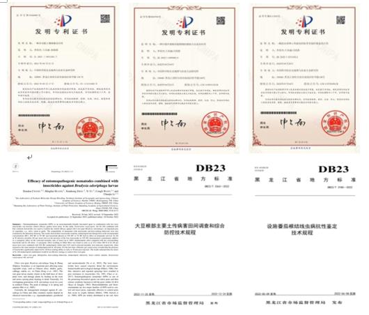 第三,科研骨干從寒區(qū)黑土農(nóng)田中分離和篩選了兩株有益細(xì)菌,具有增加大豆根瘤量、利于固氮的功能,對(duì)大豆根腐病防效達(dá)57.6%,對(duì)大豆胞囊線蟲病防效最高達(dá)81.8%;同時(shí)具有促進(jìn)植株生長(zhǎng)功能,其對(duì)蔬菜根結(jié)線蟲病防效達(dá)70%以上。這兩株細(xì)菌已經(jīng)獲得國(guó)家發(fā)明專利,并制定了黑龍江省地方標(biāo)準(zhǔn),為規(guī)范大豆根部病害的田間調(diào)查方法和科學(xué)防控提供了必要的技術(shù)規(guī)程。