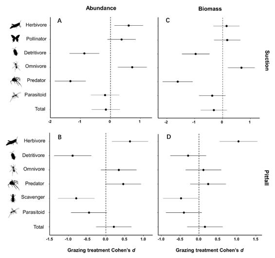 研究發(fā)現(xiàn)大型草食動物沒有對植物冠層和地表活動的節(jié)肢動物總數(shù)量產(chǎn)生顯著影響,但降低了植物冠層節(jié)肢動物總生物量(17%),增加了地表節(jié)肢動物總生物量(13%)。大型草食動物對節(jié)肢動物的影響取決于節(jié)肢動物不同營養(yǎng)級水平:放牧顯著增加植食者、傳粉者、雜食者和地表捕食者的數(shù)量和生物量,但顯著降低了分解者、食腐者、寄生者以及植物冠層的捕食者的數(shù)量和生物量(圖2)。
