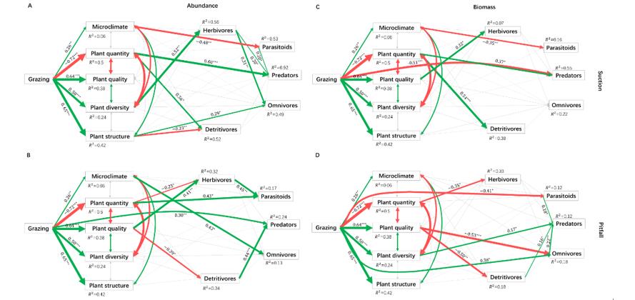 結(jié)構(gòu)方程模型進一步揭示了大型草食動物對節(jié)肢動物食物網(wǎng)的驅(qū)動機制:放牧可以通過提高植物質(zhì)量促進植食者,通過增加植物多樣性促進地表捕食者;通過減少植物生物量降低植物冠層捕食者,通過改變微氣候條件抑制寄生者(圖3)。該研究可為節(jié)肢動物多樣性保護、大型草食動物放牧管理和生態(tài)系統(tǒng)保護修復提供理論依據(jù)。
