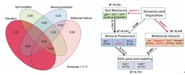 研究結(jié)果表明:長白山碳庫組分以脂肪族、烷烴、烯烴和芳香族化合物為主,碳庫熱穩(wěn)定性(TG50)隨海拔升高而降低。以錳為核心的礦物保護是長白山碳庫穩(wěn)定性維持的主要機制,其與土壤養(yǎng)分共同解釋了熱穩(wěn)定性73%的變異。盡管分子結(jié)構(gòu)抗性單獨對碳庫熱穩(wěn)定性的解釋率較低,但惰性分子豐度對土壤SOC含量及熱穩(wěn)定性具有顯著的正向效應(yīng),其中木質(zhì)素類與正構(gòu)烷烴類貢獻較高,表明其在維持碳庫及其穩(wěn)定性方面的作用依然十分重要。