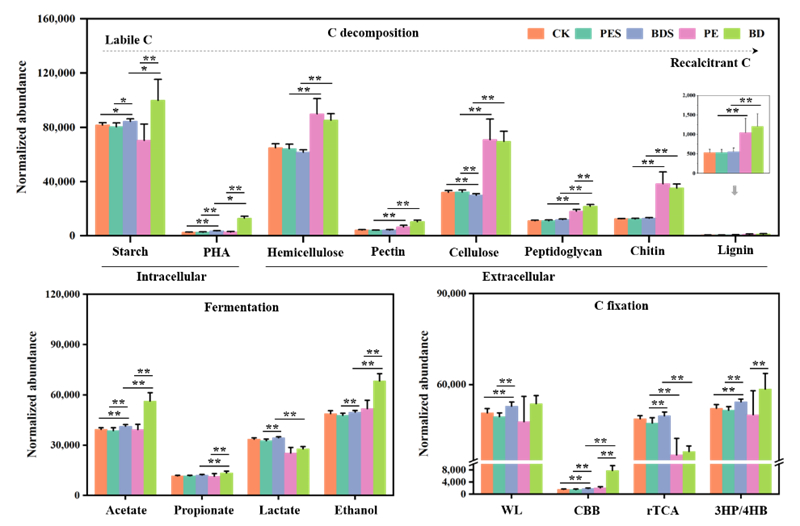 為此,東北地理所農(nóng)田分子生態(tài)學(xué)科組研究人員在前期研究的基礎(chǔ)上(J. Hazard. Mater., 2022. 2023),繼續(xù)探究傳統(tǒng)(聚乙烯,PE-MP)和生物可降解(聚乳酸-己二酸對苯二甲酸丁二醇酯,BMP)微塑料殘留對黑土及微塑料圈的碳循環(huán)相關(guān)功能微生物及微塑料的酶解特征。