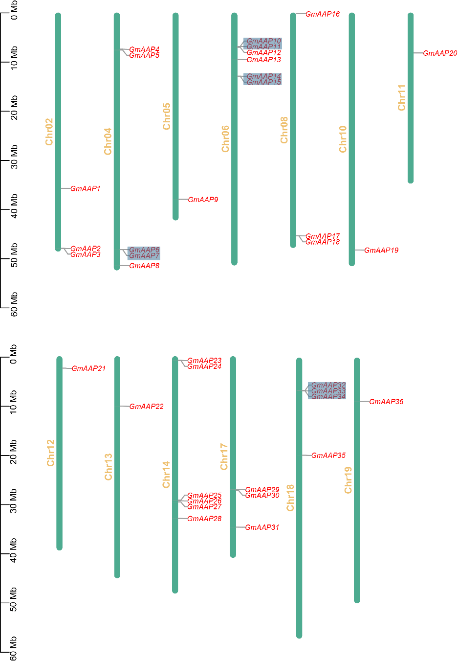 東北地理所大豆遺傳與分子改良學(xué)科組張恒友研究員團(tuán)隊(duì)在大豆基因組(Glycine max Wm82.a2.v1)中鑒定了36個(gè)大豆GmAAP基因(圖1)。全面調(diào)查了GmAAPs的基因結(jié)構(gòu)、保守結(jié)構(gòu)域、進(jìn)化關(guān)系和啟動(dòng)子區(qū)的順式調(diào)控元件及其在低氮脅迫下的表達(dá)模式。研究鑒定了5個(gè)GmAAPs基因顯著響應(yīng)低氮脅迫,為評價(jià)AAPs基因?qū)Υ蠖沟鞍踪|(zhì)積累的影響提供了基因資源。目前,研究團(tuán)隊(duì)正在對重要的GmAAP基因開展轉(zhuǎn)基因功能分析,進(jìn)一步闡明AAP如何影響植物生長或種子蛋白質(zhì)含量。
