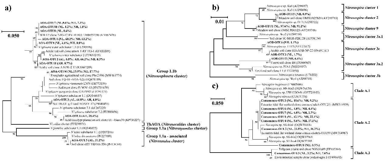 圖2 基于amoA基因13C標(biāo)記的重層DNA中AOA(a)、AOB(b)和comammox Clade A(c)的氨基酸序列構(gòu)建的系統(tǒng)發(fā)育樹(shù)