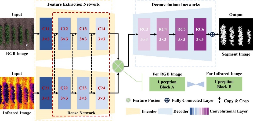 近日,中國科學(xué)院東北地理與農(nóng)業(yè)生態(tài)研究所馮獻(xiàn)忠團(tuán)隊(duì)從中國東北地區(qū)收集了200份代表性大豆品種,并利用無人機(jī)飛行系統(tǒng)采集了表型數(shù)據(jù)。為了克服高通量表型研究中遇到的挑戰(zhàn),設(shè)計(jì)了一個(gè)專門用于大豆田間冠層分割的多模態(tài)深度學(xué)習(xí)模型——RIFSeg-Net,并利用紅外信息提高無人機(jī)拍攝的RGB圖像中大豆冠層的分割精度。通過動(dòng)態(tài)建模,利用時(shí)間序列無人機(jī)圖像數(shù)據(jù)提取并構(gòu)建了與冠層發(fā)育動(dòng)態(tài)相關(guān)的五個(gè)表型參數(shù)。該方法展示了典型的無人機(jī)高通量表型解21析過程,提出了對大豆生長模式和動(dòng)態(tài)監(jiān)測的見解,并成功應(yīng)用于田間大規(guī)模種質(zhì)資源鑒定,為培育高產(chǎn)大豆品種提供了強(qiáng)有力的工具。