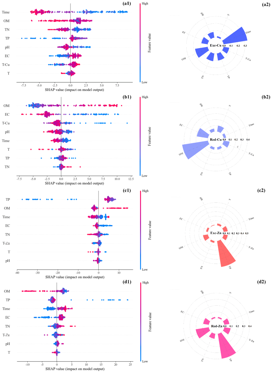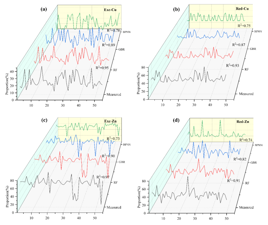 本研究基于課題組15年的數(shù)據(jù)累積及外部數(shù)據(jù)的收集,共取得260組數(shù)據(jù)。以堆肥過程中常見的物質變化指標(堆肥時間、溫度、pH、EC、OM、TP、TN和重金屬總量)為輸入因子,借助反向傳播神經(jīng)網(wǎng)絡(BPNN)、梯度增強回歸模型(GBR)、隨機森林模型(RF),建立了堆肥過程中重金屬形態(tài)快速預測模型,從而對重金屬有效性進行評估。研究結果表明:BPNN、GBR和RF模型均能預測堆肥過程中Cu和Zn的形態(tài)分布(圖1),其中RF的預測性能最好,R2值為0.93-0.97。同時,輸入因子的特征性分析表明(圖2),除堆肥時間外,OM和TP分別是預測Cu和Zn有效形態(tài)的最重要特征,降低OM或增加TP有助于提升堆肥中Cu和Zn的鈍化能力。本研究識別了Cu和Zn生物有效形態(tài)之間轉化的主要影響因子,為評估堆肥生產(chǎn)中重金屬生物有效性評估及調控提供了一種快速的決策工具;同時拓展了人工智能方法在有機固廢資源化領域的適用性,對于構建生態(tài)安全的種養(yǎng)結合、農(nóng)牧循環(huán)新格局具有重要推動意義。