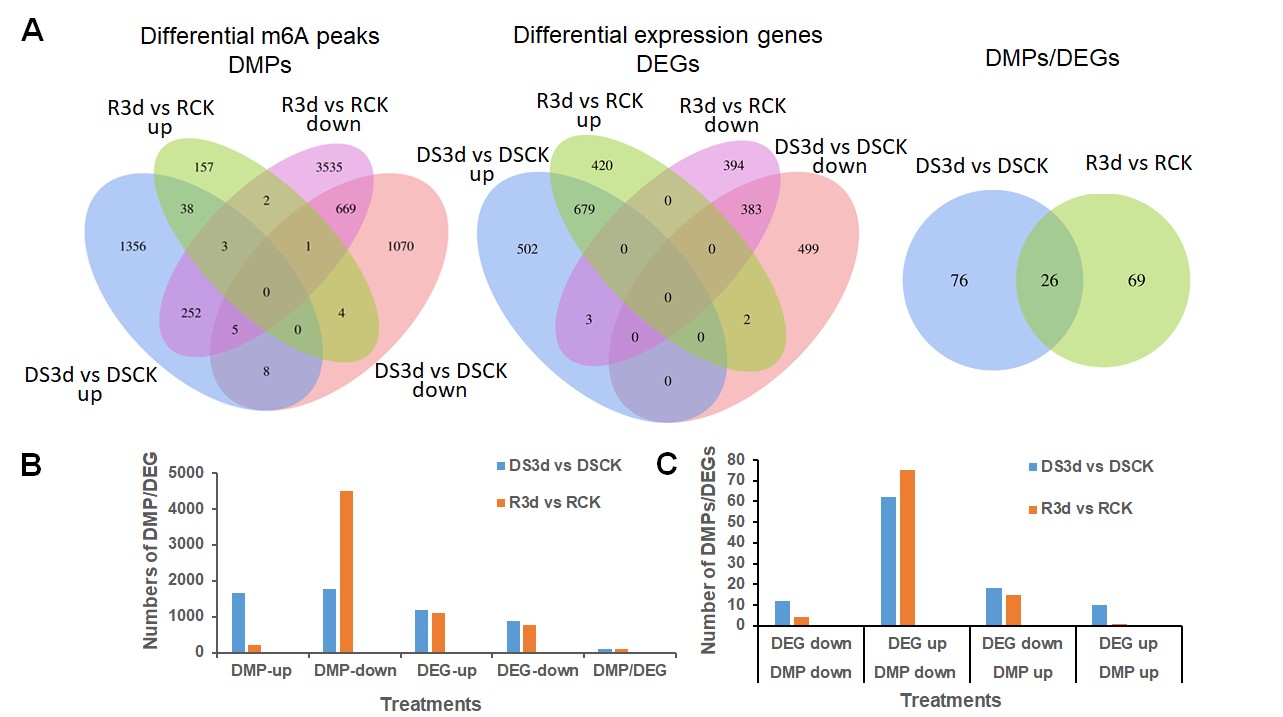 圖1 抗感大豆品種在SCN侵染3d后的m6A甲基化峰(DMPs)和基因表達(DEGs)的差異